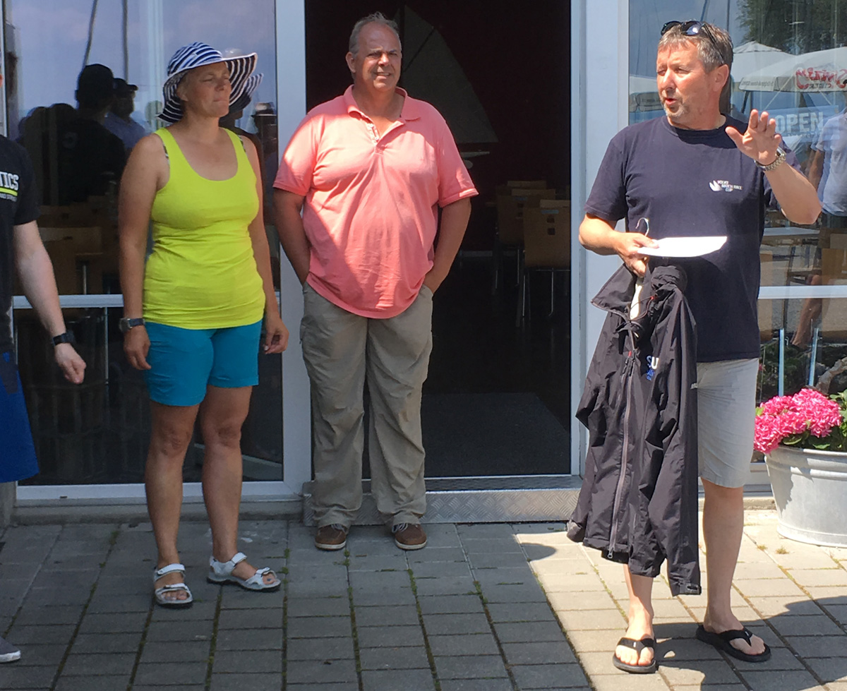 Regattaleiterin Susi Schulze schickte die 12 Crews nach der Skipperbesprechung um 12.30 Uhr umgehend aufs Wasser. Der schwache und immer wieder drehende Wind lies am Samstag nur eine Wettfahrt zu. Entschädigt wurden die Segler in der Mole mit Freibier und einem feinen Nachtessen.
