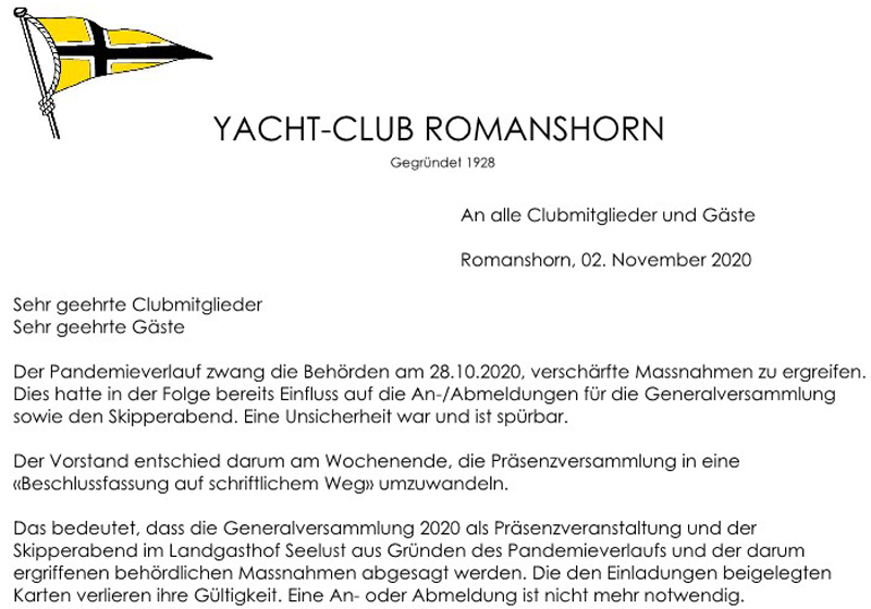 Der Vorstand entschied am Wochenende 30.10./01.11.2020, die Präsenzversammlung in eine «Beschlussfassung auf schriftlichem Weg» umzuwandeln.
